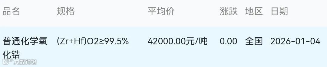 2026年01月04日氧化锆材料市场参考价: