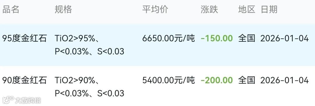 2026年01月04日金红石材料市场参考价: