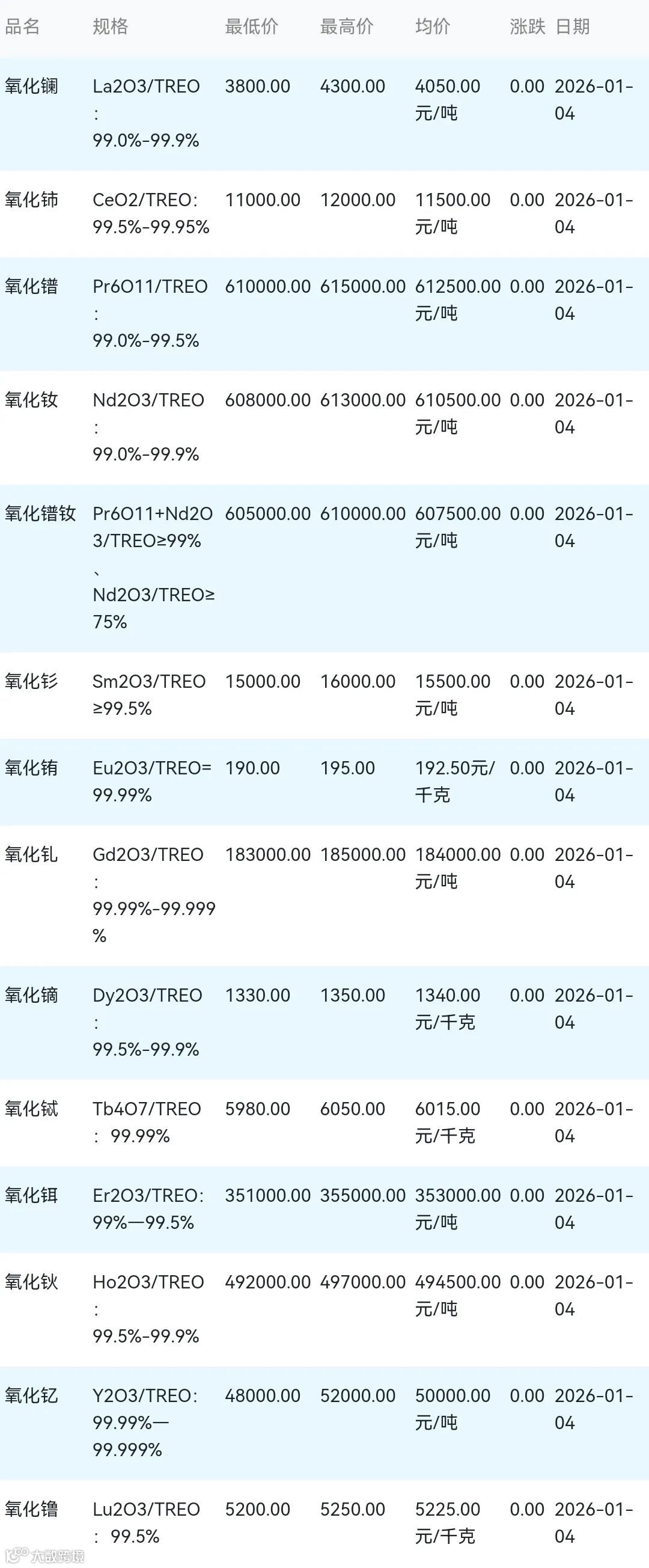 2026年01月04日稀土氧化物材料市场参考价: