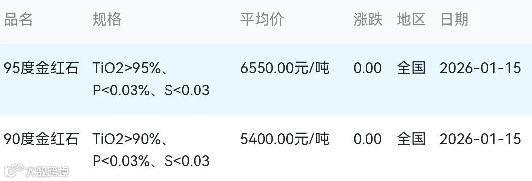 2026年01月15日金红石材料市场参考价: