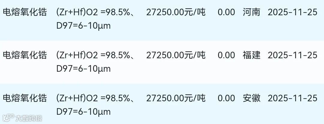 2025年11月25日氧化锆材料市场参考价: