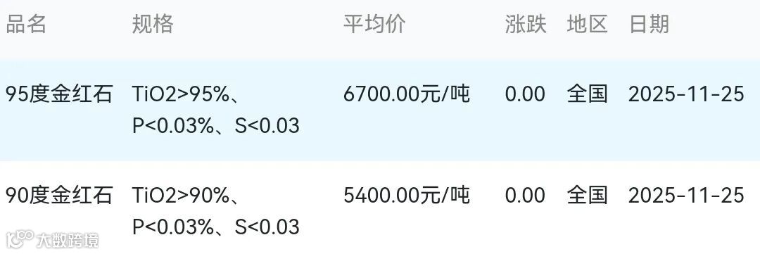 2025年11月25日金红石材料市场参考价: