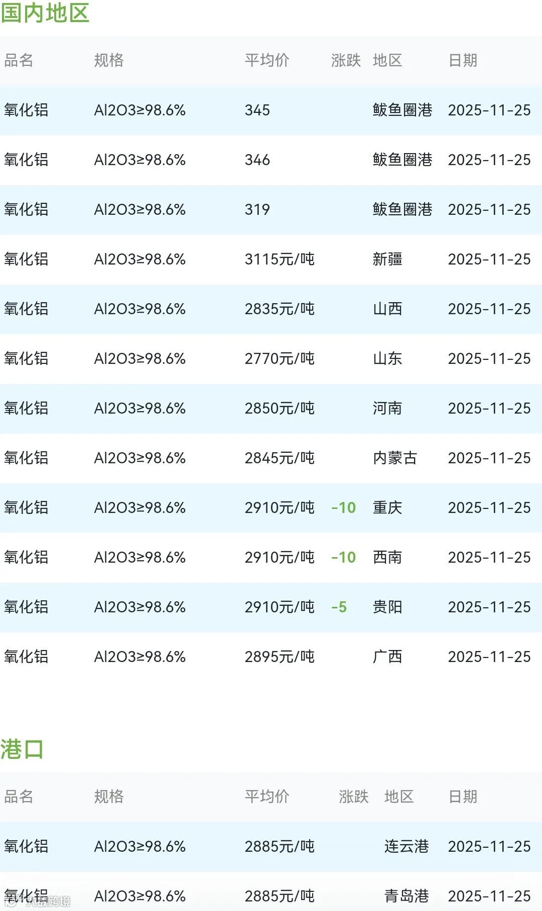 2025年11月25日氧化铝粉体材料市场参考价: