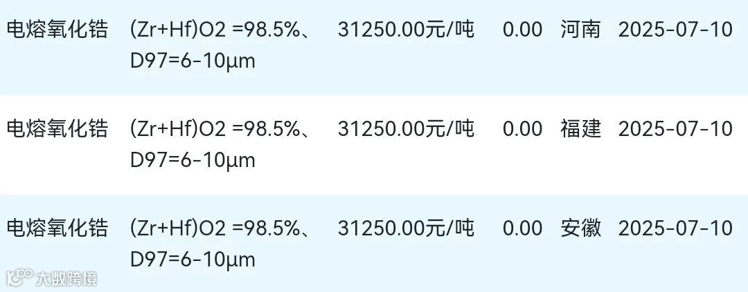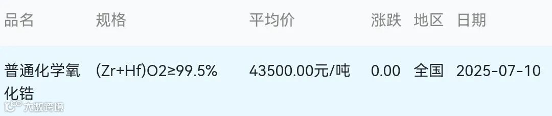 2025年07月10日氧化锆材料市场参考价:
