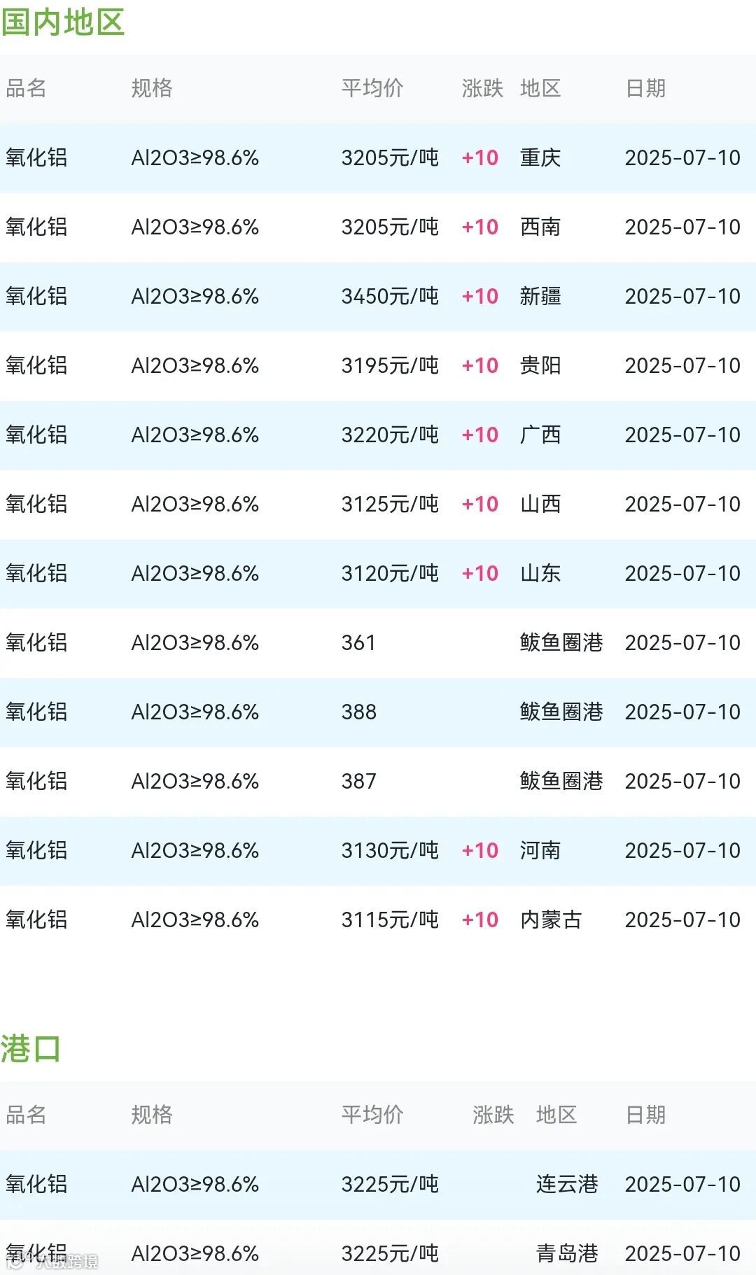 2025年07月10日氧化铝粉体材料市场参考价: