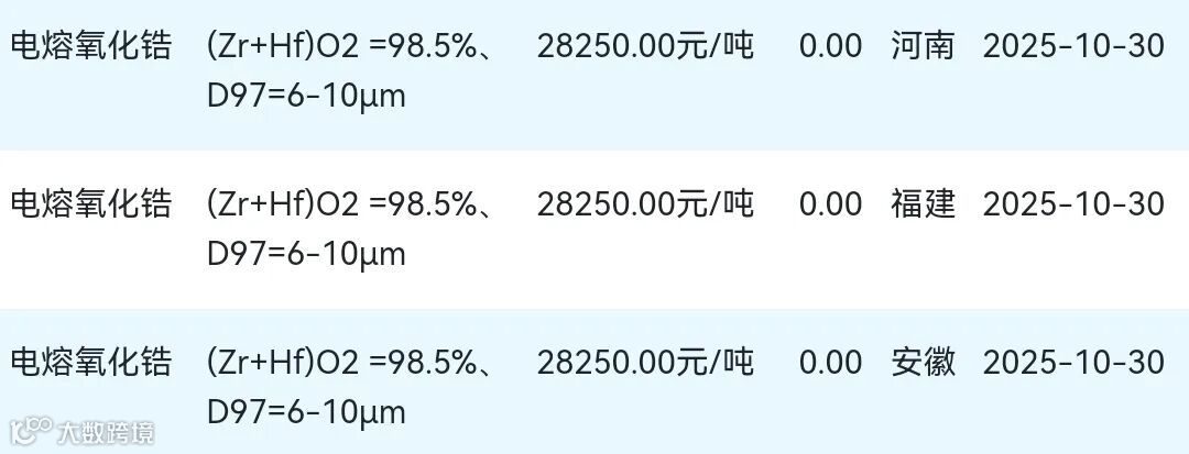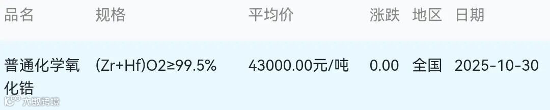 2025年10月30日氧化锆材料市场参考价: