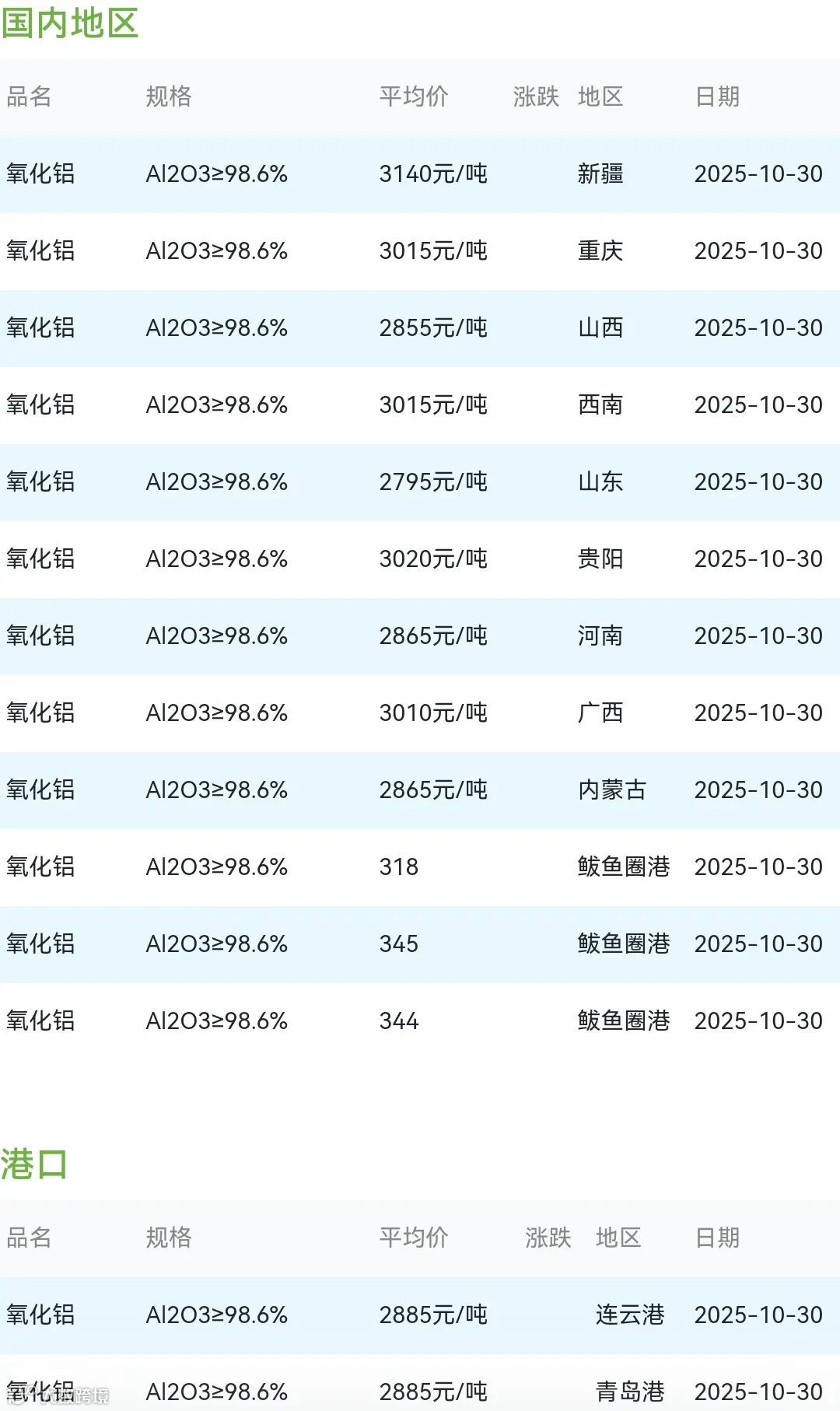 2025年10月30日氧化铝粉体材料市场参考价: