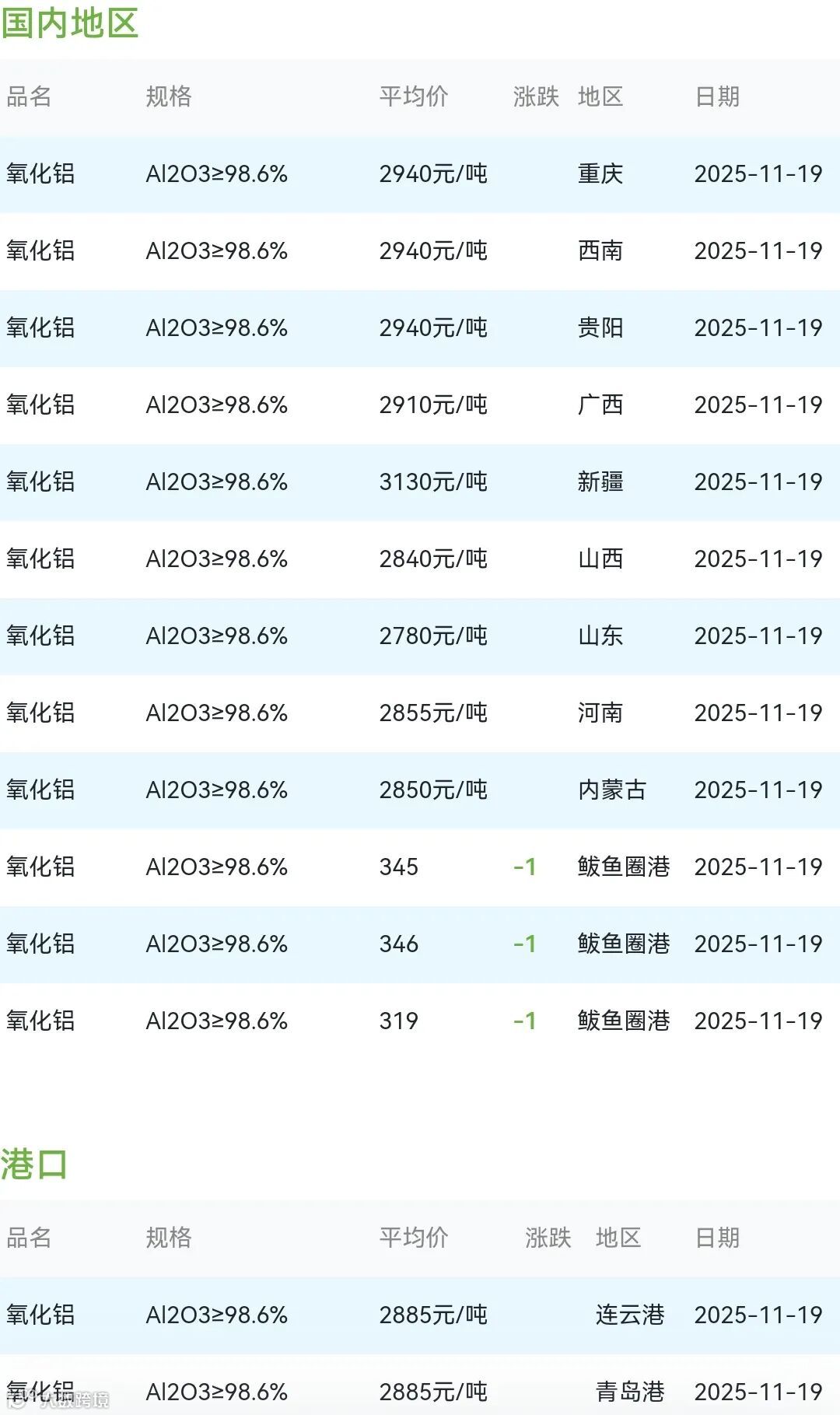 2025年11月19日氧化铝粉体材料市场参考价: