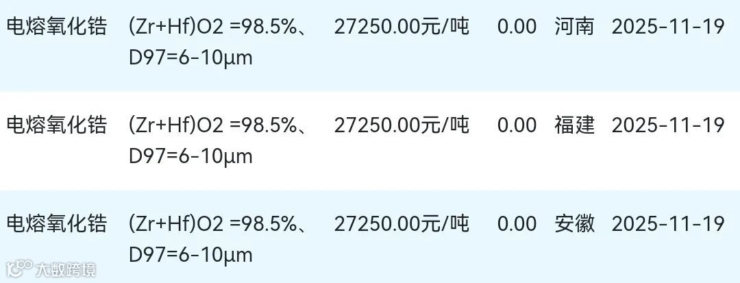 2025年11月19日氧化锆材料市场参考价: