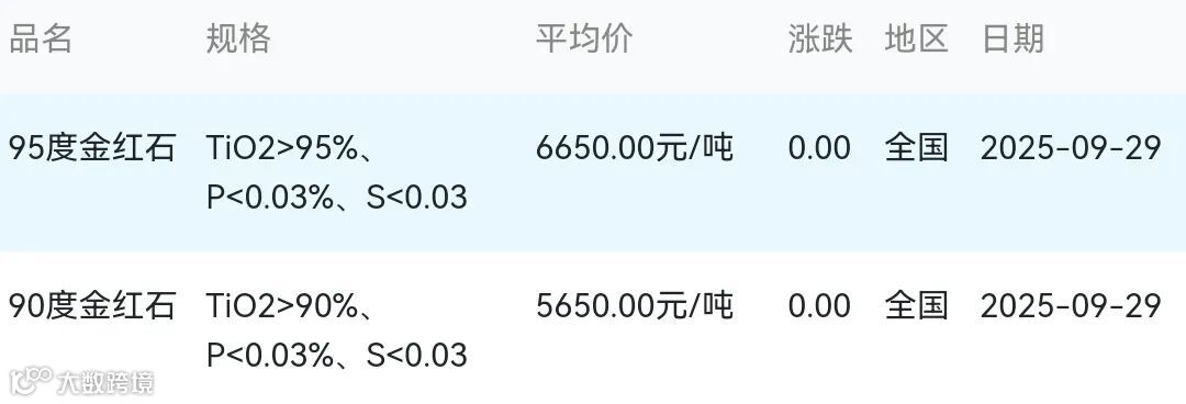2025年09月29日金红石材料市场参考价: