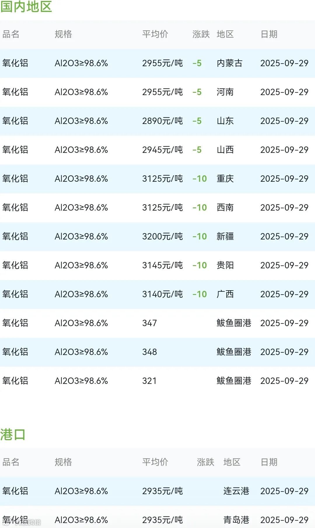 2025年09月29日氧化铝粉体材料市场参考价: