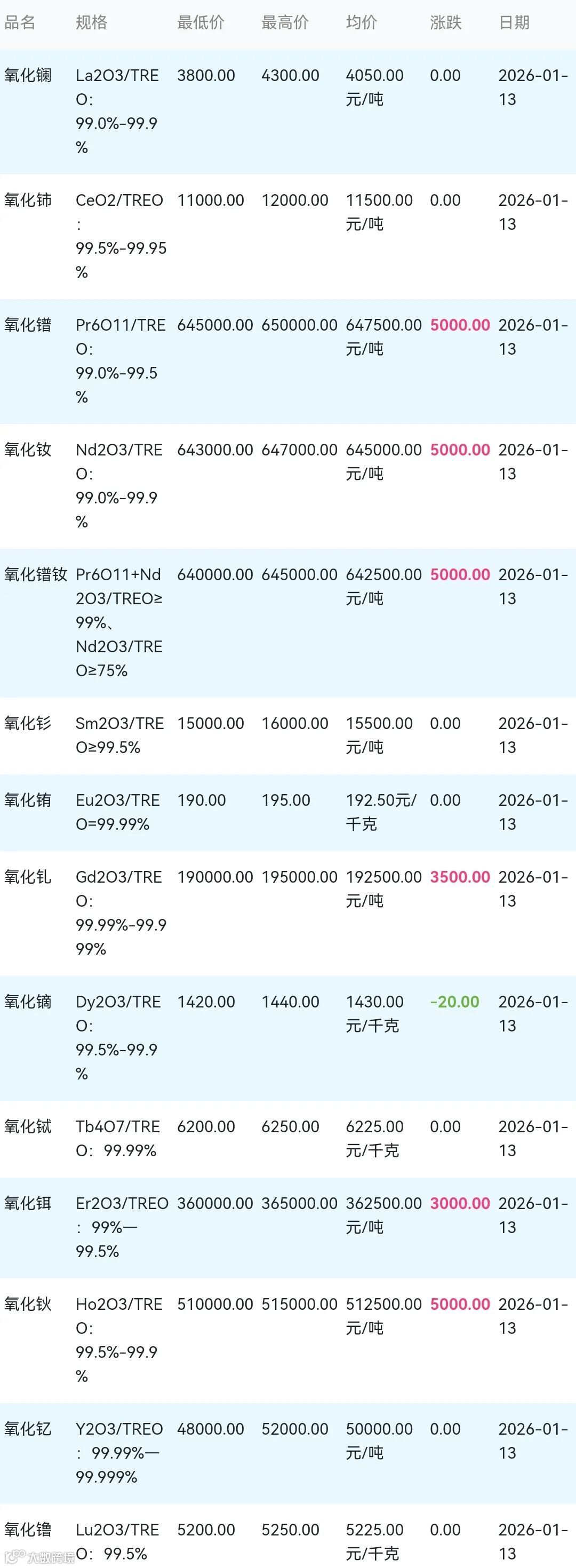 2026年01月13日稀土氧化物材料市场参考价:
