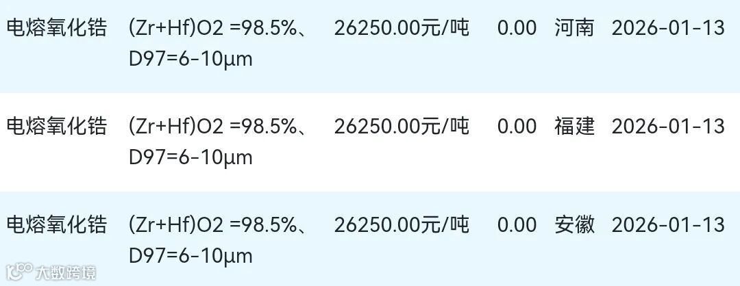 2026年01月13日氧化锆材料市场参考价:
