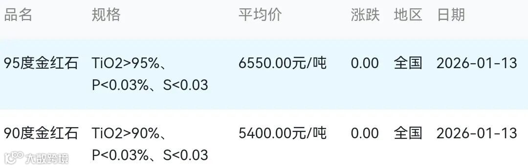 2026年01月13日金红石材料市场参考价: