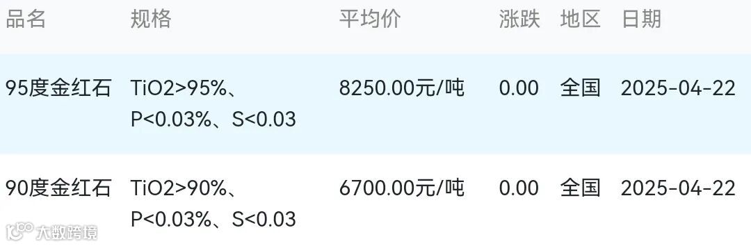 2025年04月22日金红石材料市场参考价: