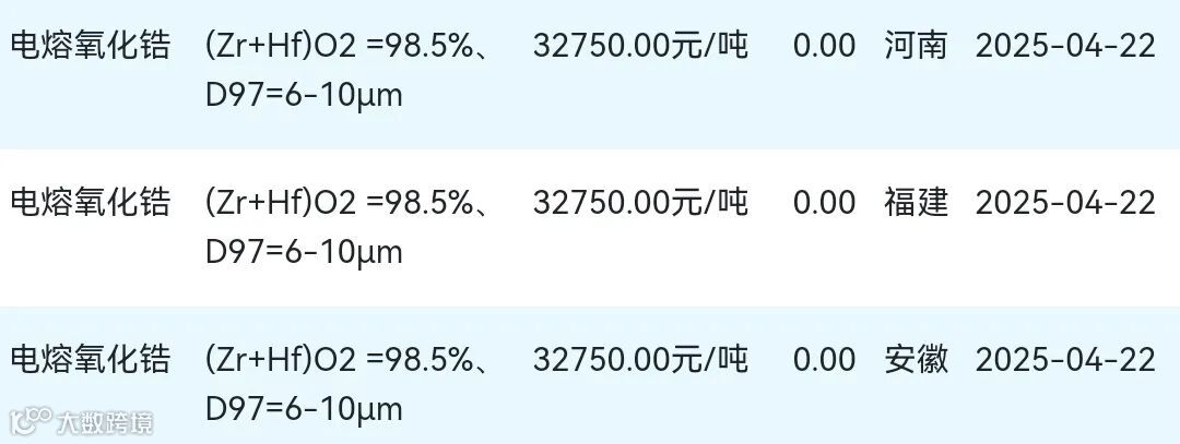 2025年04月22日氧化锆材料市场参考价: