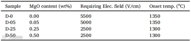 表2:Al2O3闪烧的起始温度与电场强度。MgO掺杂浓度对氧化铝闪烧触发条件有显著影响。在1350°C时,未掺杂样品(D-0)在5500 V/cm下无法触发闪烧,而0.05 wt% MgO掺杂样品(D-05)可在5000 V/cm触发。MgO含量更高的样品(D-25和D-50)触发条件进一步降低至2500 V/cm和1300°C。结果表明,随着MgO含量增至0.25 wt%,闪烧触发条件逐渐降低,而继续增加MgO含量则趋于稳定。
