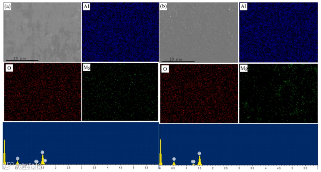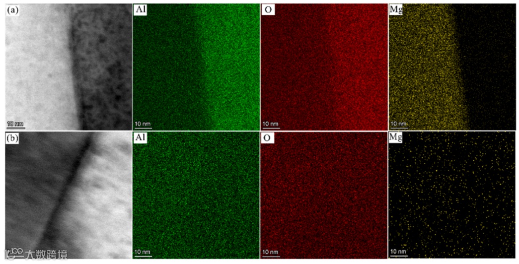 图7:PS-ed烧结致密的0.25 wt% MgO掺杂Al2O3陶瓷片在(a)闪烧处理前和(b)闪烧处理后的元素分布图。传统烧结的0.25 wt% MgO掺杂Al2O3圆片经闪烧处理后,TEM-EDS mapping显示Mg元素分布更均匀,进一步证实了闪烧对溶解度的促进作用。