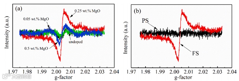 图5:闪烧样品的EPR结果。所有闪烧样品均显示g=2.004的EPR信号,对应于氧空位中捕获的电子。氧空位信号随MgO含量增至0.25 wt%而增强,但增至0.5 wt%时减弱(表3)。这一变化与相对密度和晶粒尺寸的变化一致。图5(b)对比了闪烧和传统烧结0.25 wt% MgO掺杂Al2O3的氧空位。传统烧结样品几乎无氧空位信号,而闪烧样品的信号显著更强,表明其氧空位浓度远高于传统烧结样品(表3)。这是闪烧与传统烧结在致密化和晶粒生长行为上差异的主要原因。