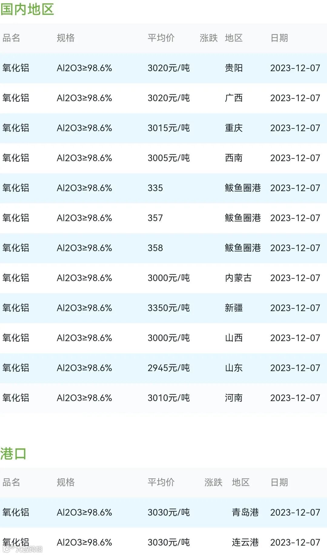 2023年12月07日氧化铝粉体材料市场参考价: