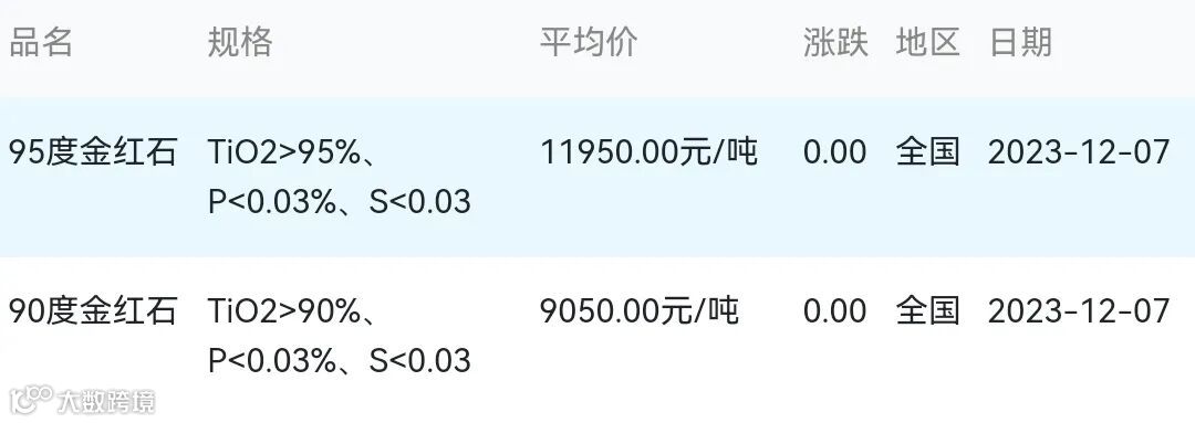 2023年12月07日金红石材料市场参考价: