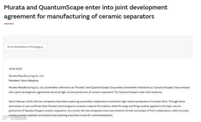 10月8日,QuantumScape与村田制作所(Murata)签订联合开发协议,大批量生产用于QuantumScape固态电池的陶瓷隔膜。