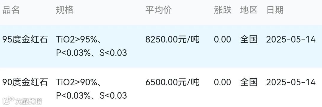 2025年05月14日金红石材料市场参考价: