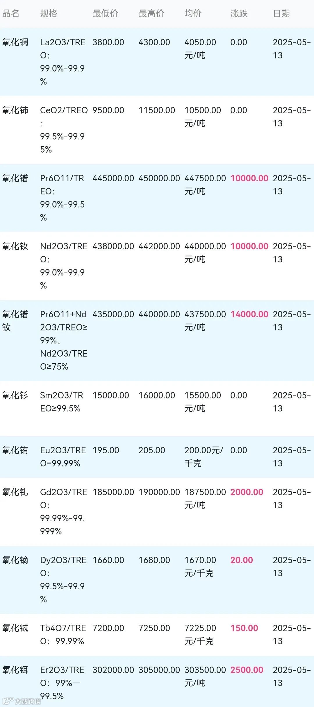 2025年05月13日稀土氧化物材料市场参考价: