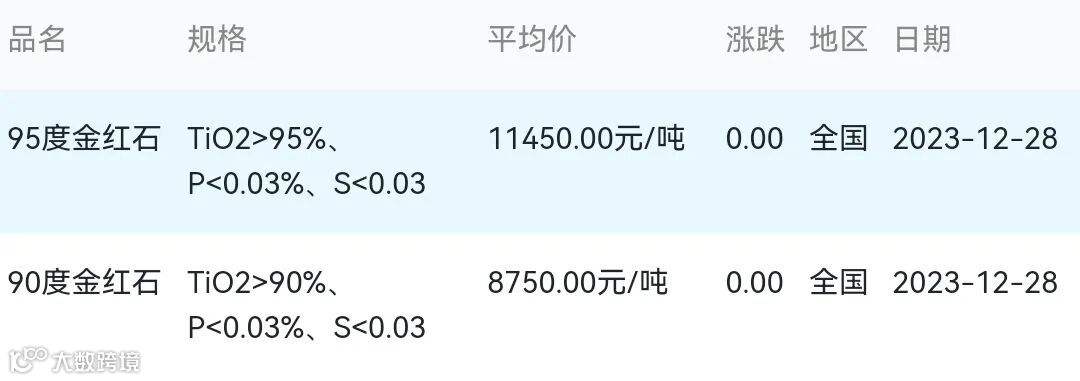 2023年12月28日金红石材料市场参考价: