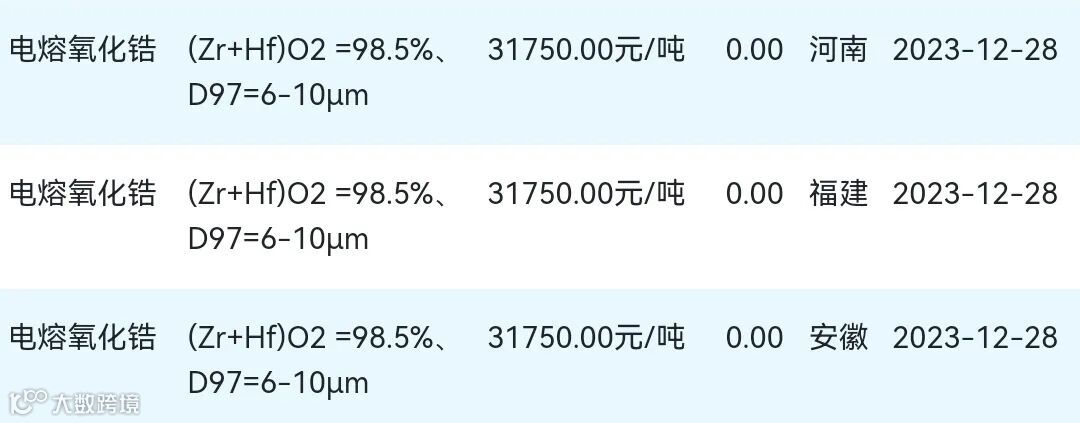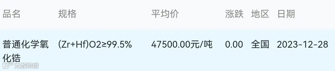 2023年12月28日氧化锆材料市场参考价: