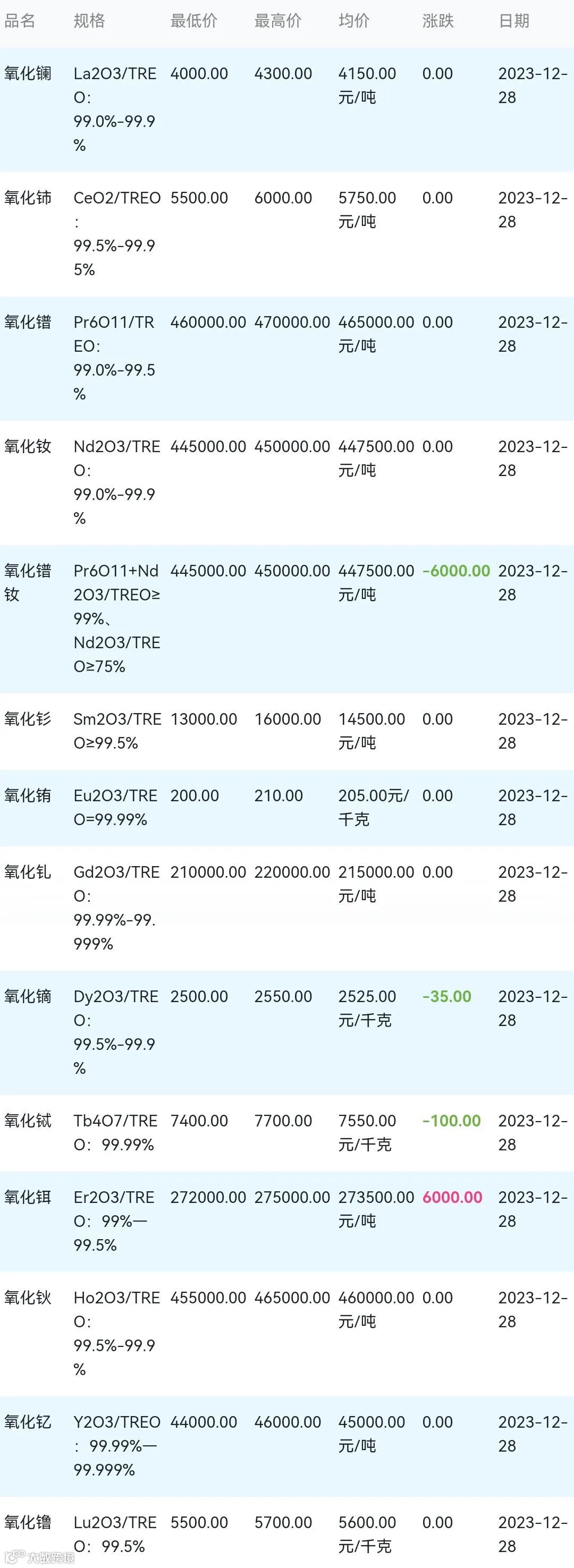 2023年12月28日稀土氧化物材料市场参考价: