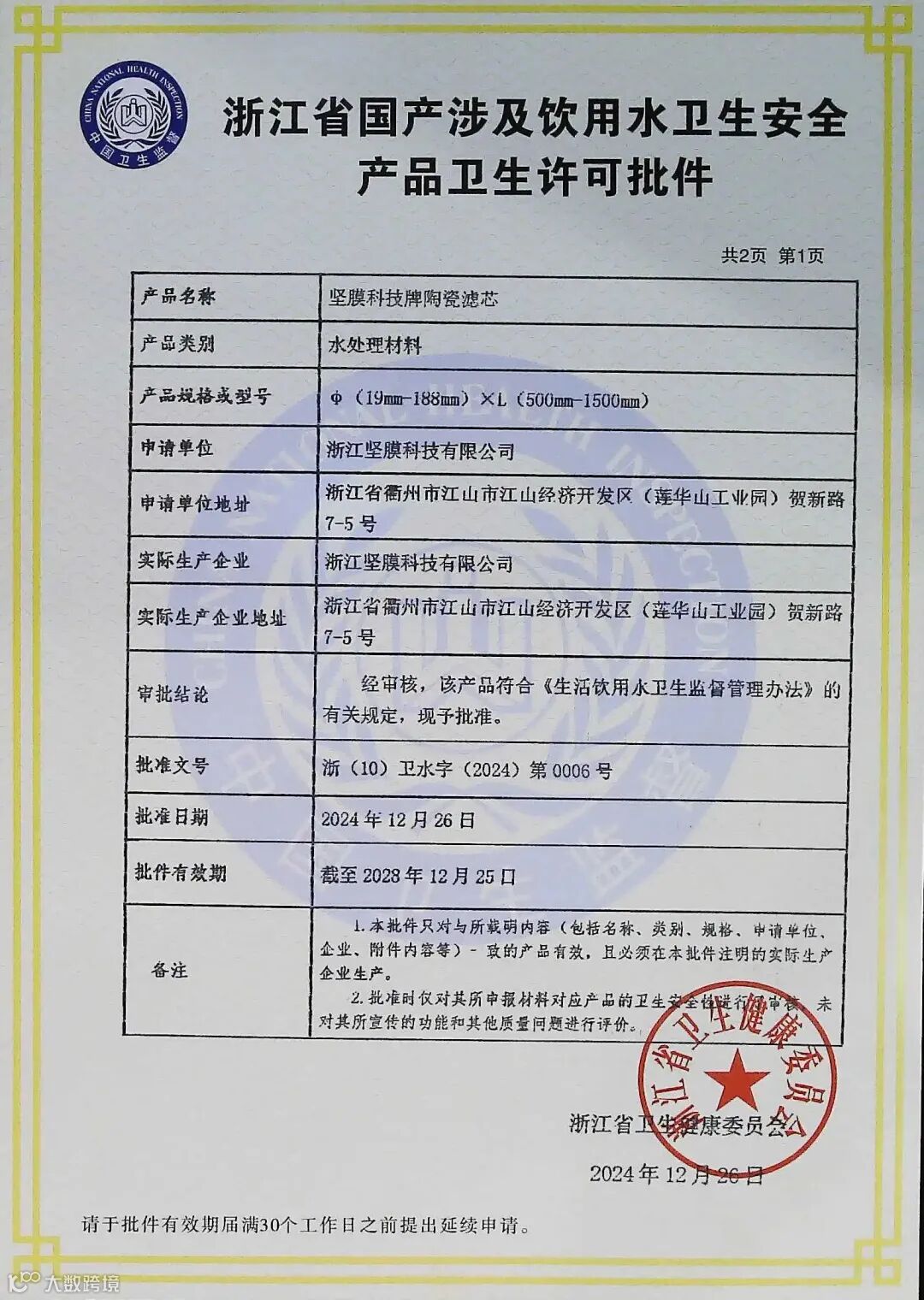 9月12日,据浙江坚膜科技有限公司消息,其核心产品——碳化硅陶瓷膜,已成功斩获NSF认证及涉水许可批件!这是产品在饮用水处理领域质量与性能的重要认可,也为公司深耕饮用水行业、更好服务客户提供了有力支撑。