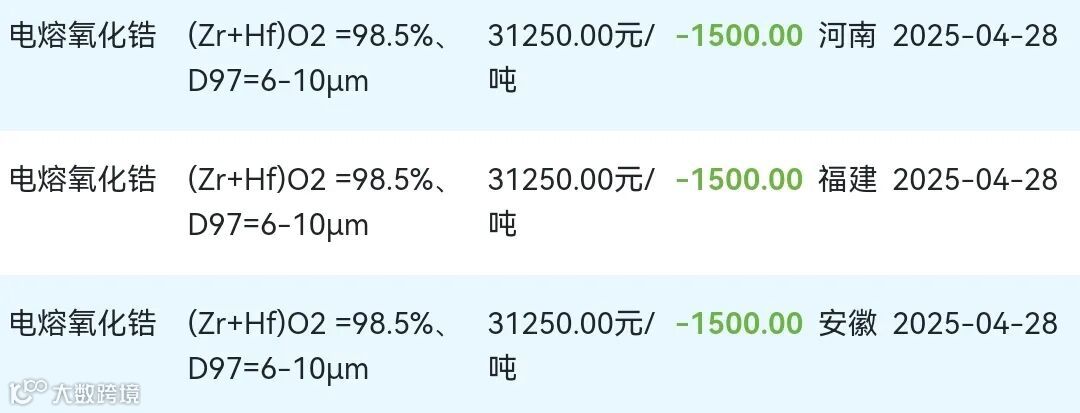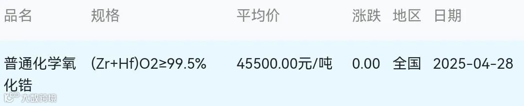 2025年04月28日氧化锆材料市场参考价: