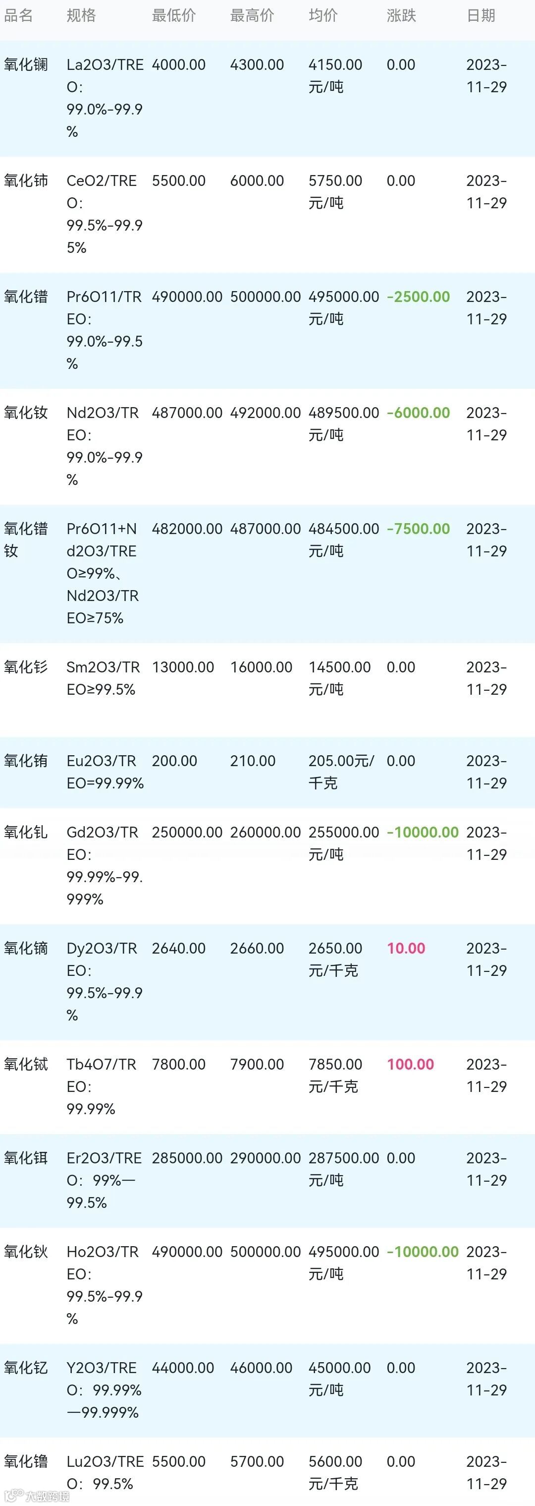 2023年11月29日稀土氧化物材料市场参考价: