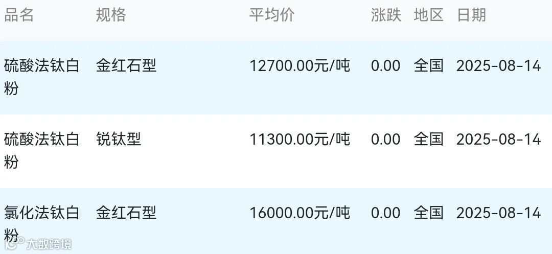 2025年08月14日钛白粉材料市场参考价: