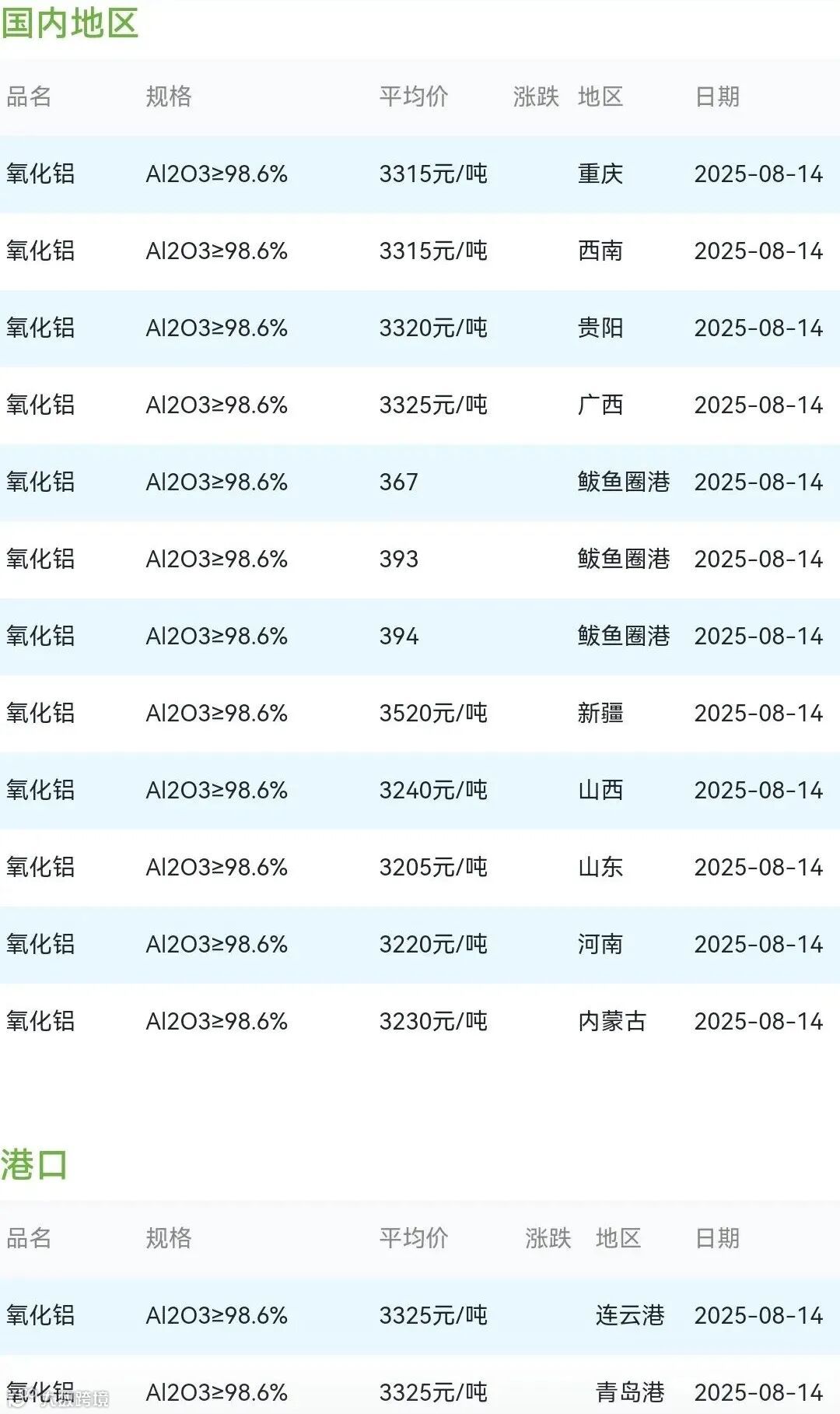 2025年08月14日氧化铝粉体材料市场参考价:
