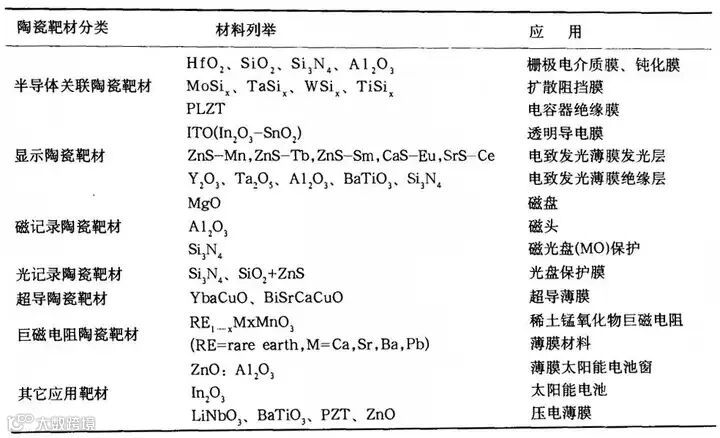 陶瓷靶材的种类及各自应用: