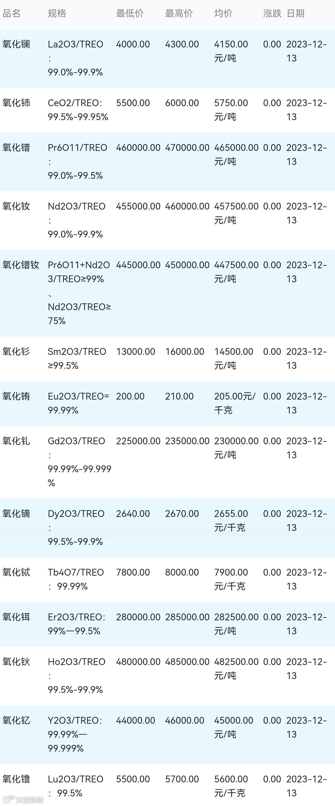2023年12月13日稀土氧化物材料市场参考价: