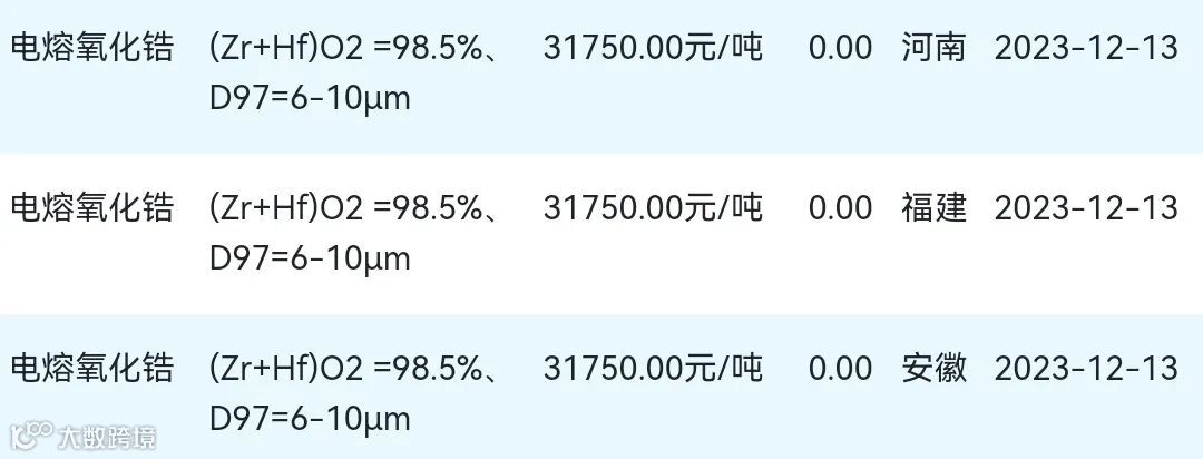 2023年12月13日氧化锆材料市场参考价: