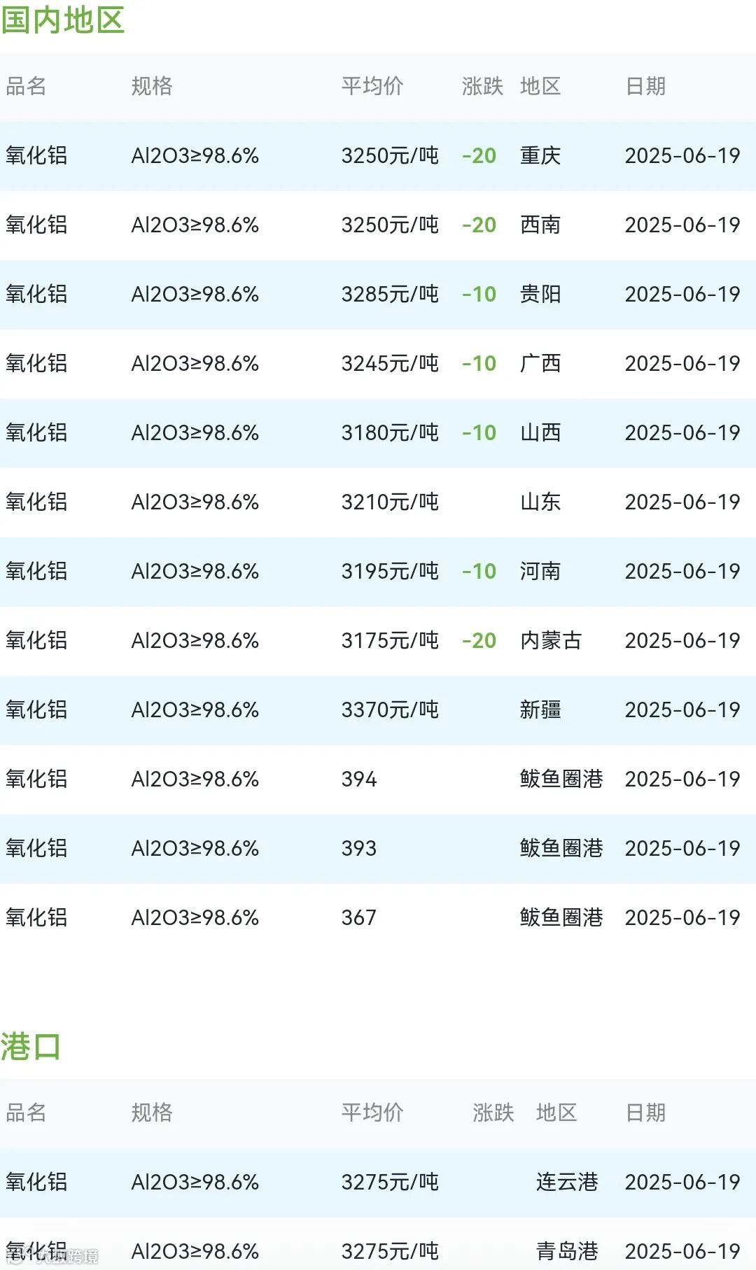 2025年06月19日氧化铝粉体材料市场参考价: