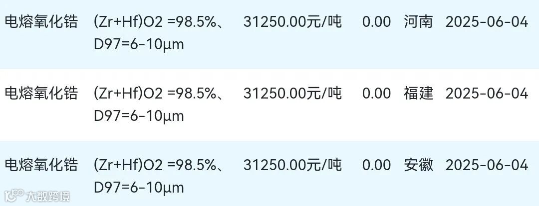 2025年06月04日氧化锆材料市场参考价: