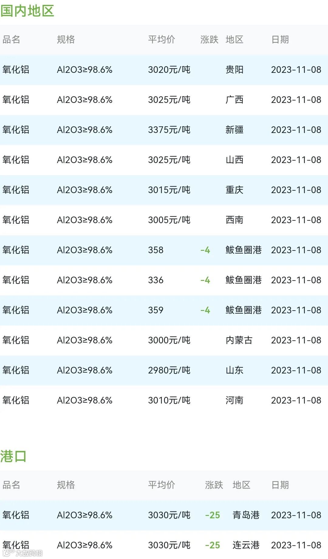 2023年11月08日氧化铝粉体材料市场参考价: