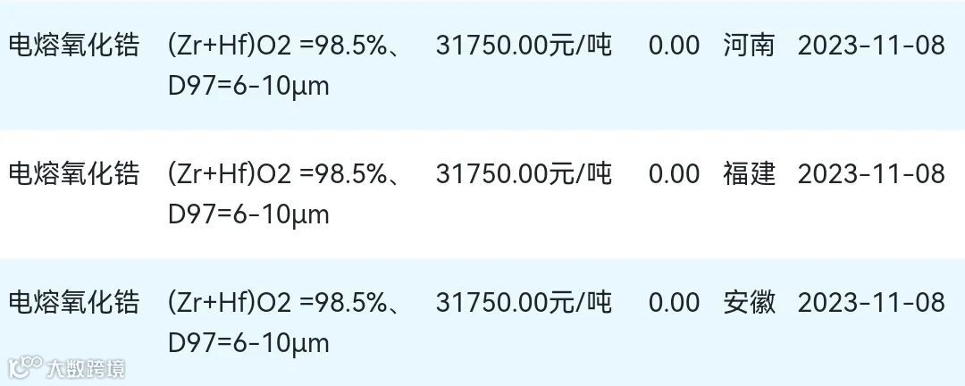2023年11月08日氧化锆材料市场参考价: