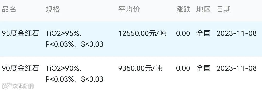 2023年11月08日金红石材料市场参考价: