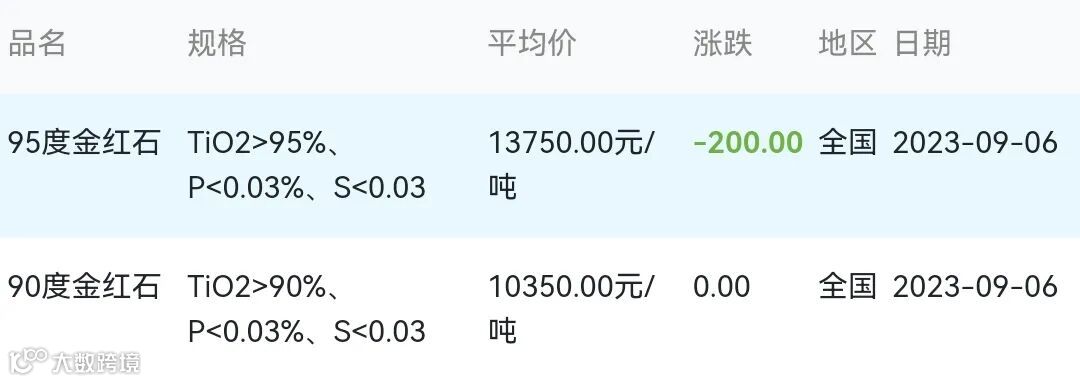 2023年09月06日金红石材料市场参考价: