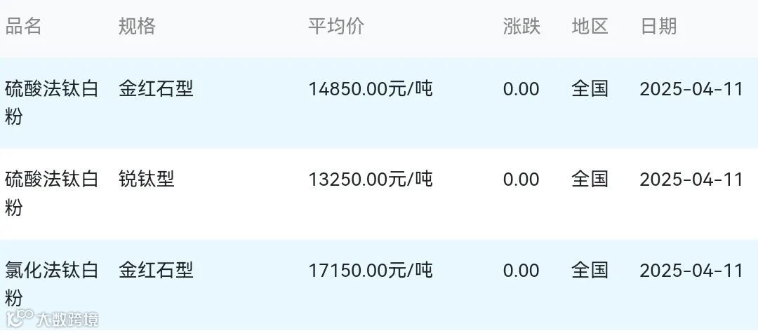 2025年04月11日钛白粉材料市场参考价: