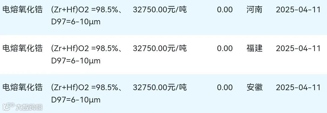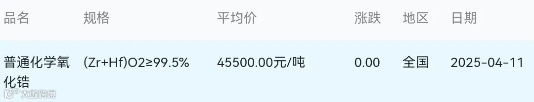 2025年04月11日氧化锆材料市场参考价: