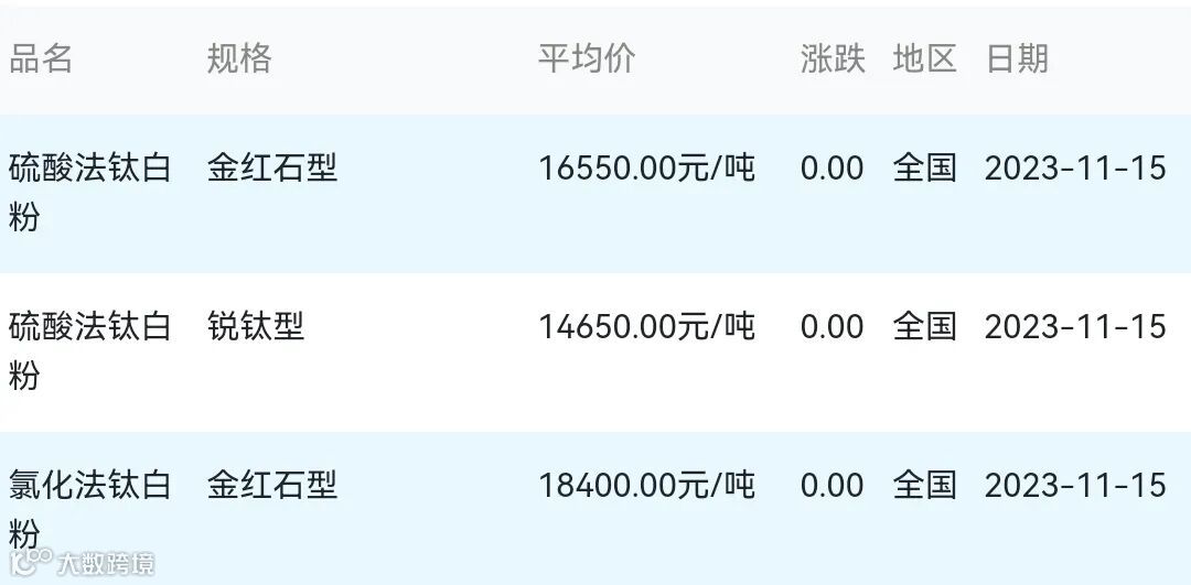 2023年11月15日钛白粉材料市场参考价: