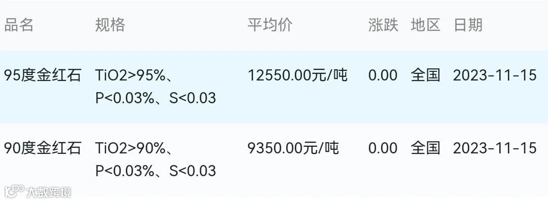 2023年11月15日金红石材料市场参考价: