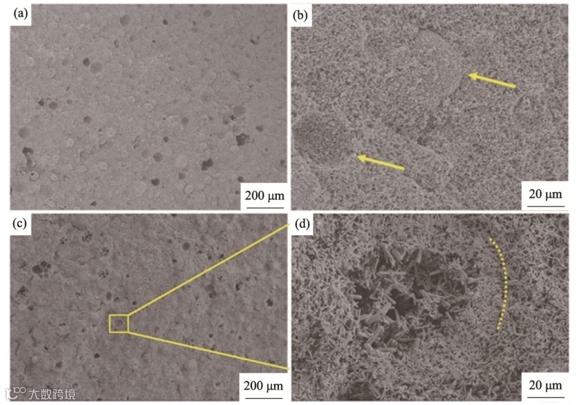 ▲以空心微珠为造孔剂制备Si3N4多孔陶瓷的SEM图:(a)~(b)凝胶注模成型法;(c)~(d)分散剂反应失效法